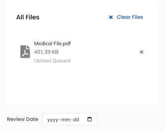 - Once you've added files to the upload queue, you will have the option to add a Review Date. This date will be used as a guideline to prioritize files in the processing pipeline.