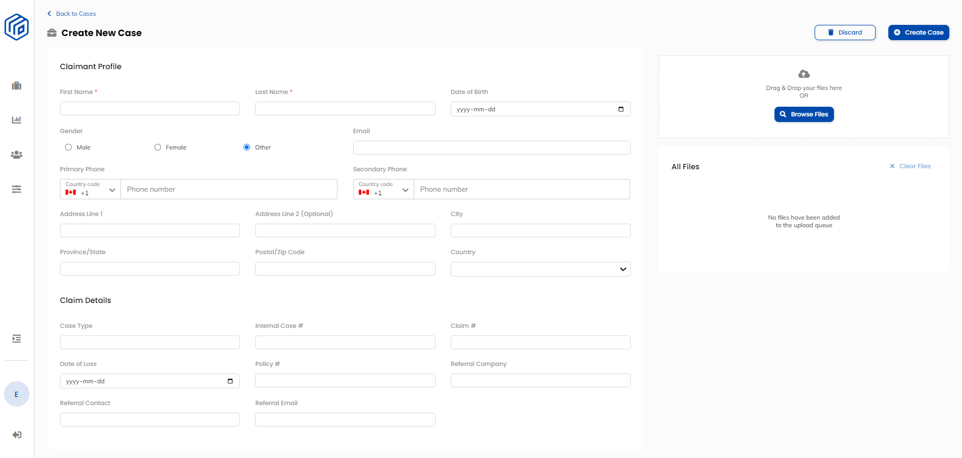 Fill in case information and upload files on the 'Create a case' page to create a new case.