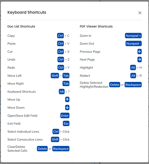 There are a number of keyboard shortcuts that can be used on the Doc List and the PDF Viewer to work more efficiently.